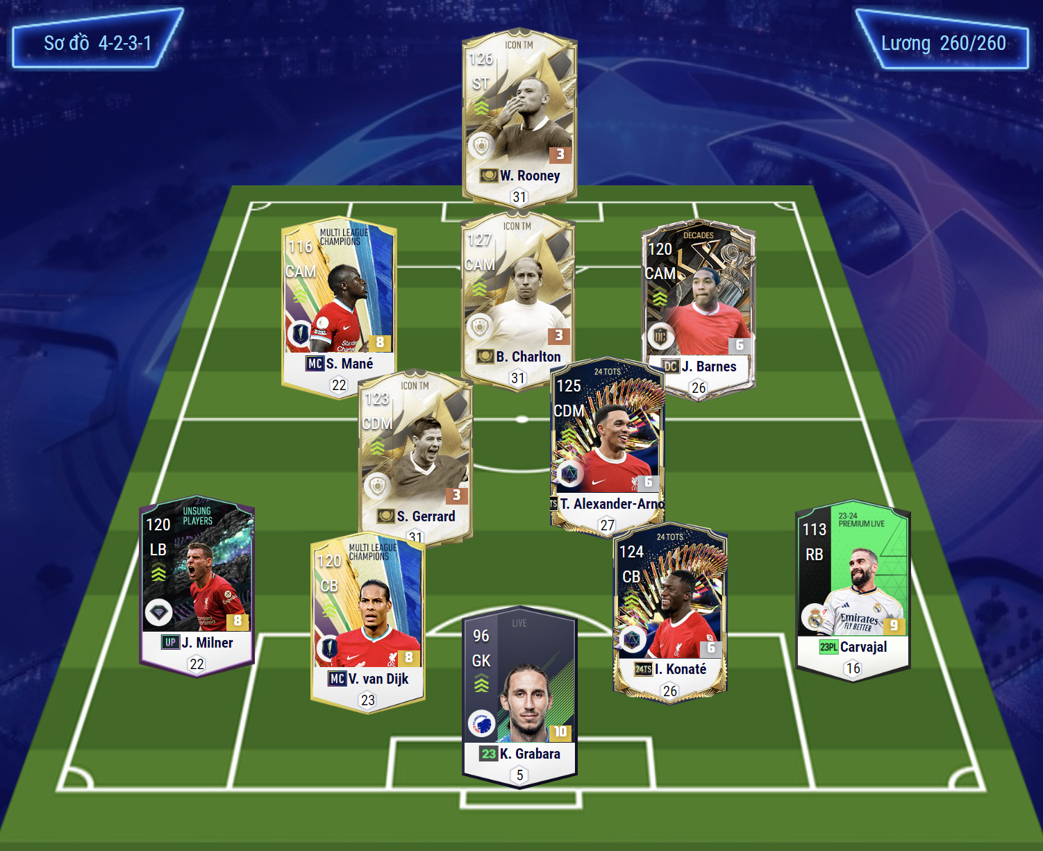Ở vị trí tiền vệ phòng ngự, bộ đôi Gerrard và Arnold được tin tưởng khi sở khả năng chuyền bóng và sút xa cực kì ấn tượng. Ở hàng phòng ngự, cặp hậu vệ biên Milner và Carvajal. Trong khi đó bộ đôi trung vệ Van Dijk và Konate được đánh giá là trung vệ thép của đội. Thủ môn Grabara được lựa chọn với thể hình to cao cùng team color Liverpool phù hợp với đội hình.