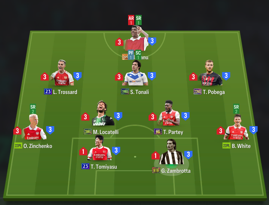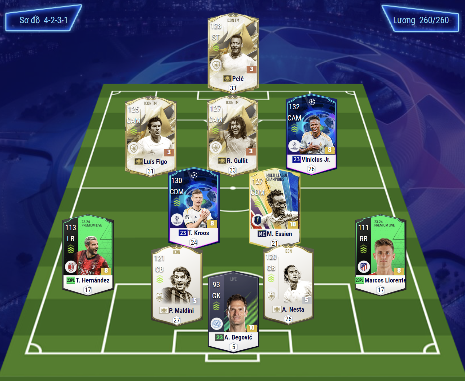 Sơ đồ 4231 được lựa chọn với vị trí chơi cao nhất trên hàng công là Pele. Bộ 3 tiền vệ công được lựa chọn lần lượt là Figo, Gullit và Vinicius cho 3 vị trí LAM, CAM, RAM. Với 2 vị trí chạy cánh yêu cầu tốc độ và khả năng tạt bóng tốt trong khi đó tiền vệ công CAM Gullit gần như toàn diện cả về tấn công lẫn phòng ngự.