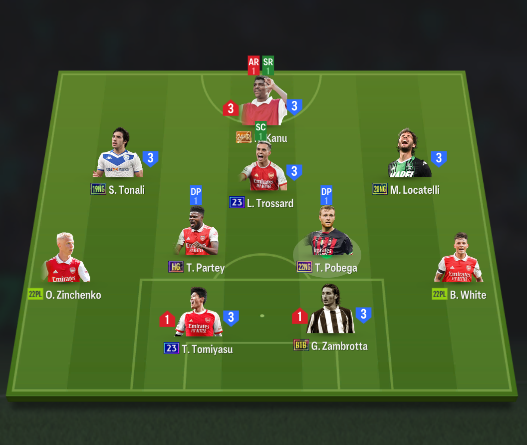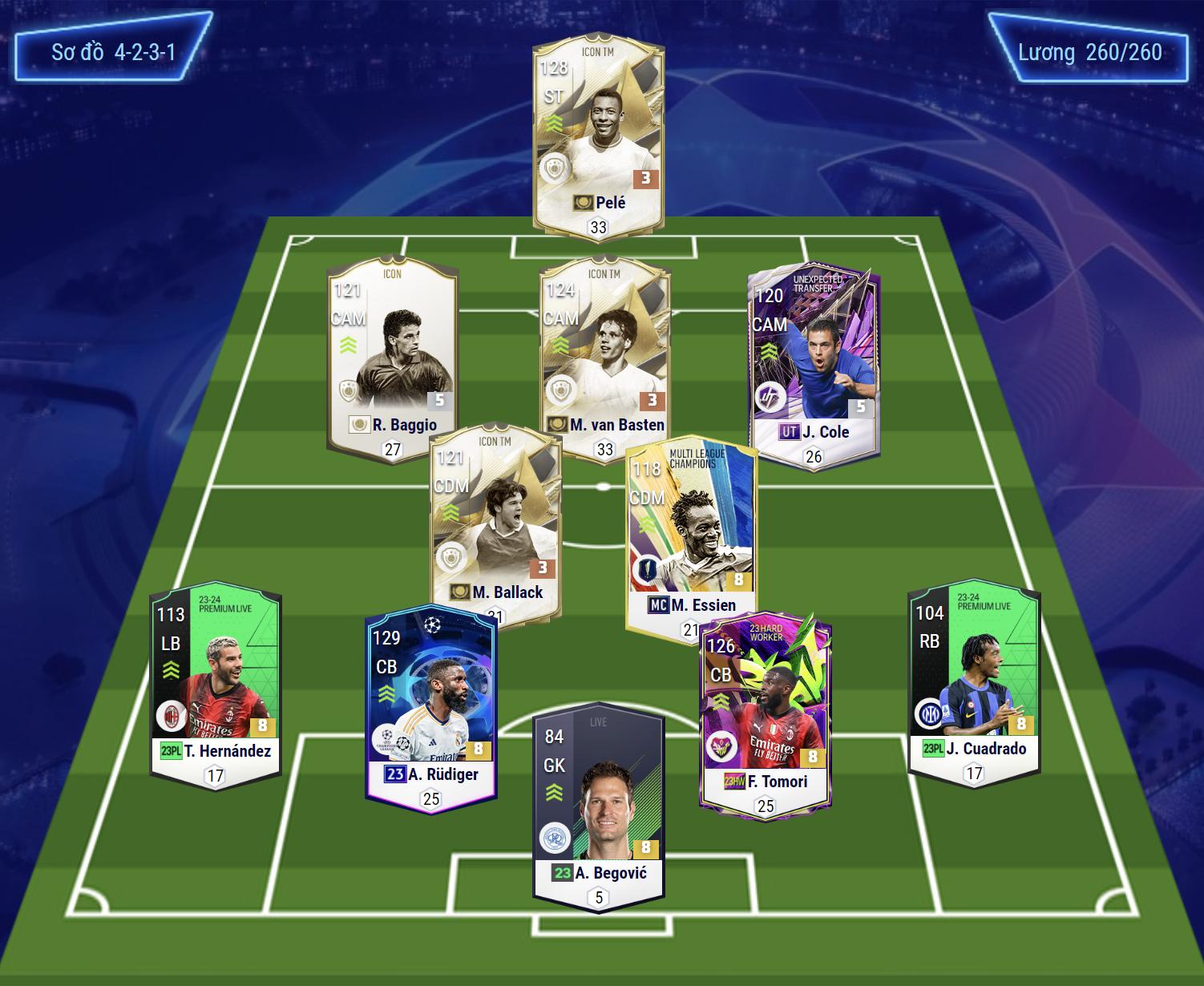 Đội hình được lựa chọn với vị trí cao nhất trên hàng công là Pele, bộ 3 tiền vệ công với vị trí trung tâm là Basten, cặp tiền vệ lệch trái phải LAM, RAM lần lượt là Baggio và A.Cole. Cả 2 đều có kỹ năng chuyền bóng và sút xa rất ấn tượng.