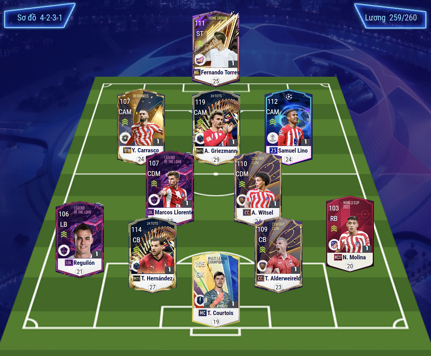 Sơ đồ 4231 với vị trí cao nhất trên hàng công là Fernando Torres. Bộ 3 tiền vệ công LAM, CAM, RAM lần lượt là những cái tên Carrasco, Griezmann, Lino. 3 cái tên chất lượng và có giá trị sử dụng cao ở thời điểm hiện tại.