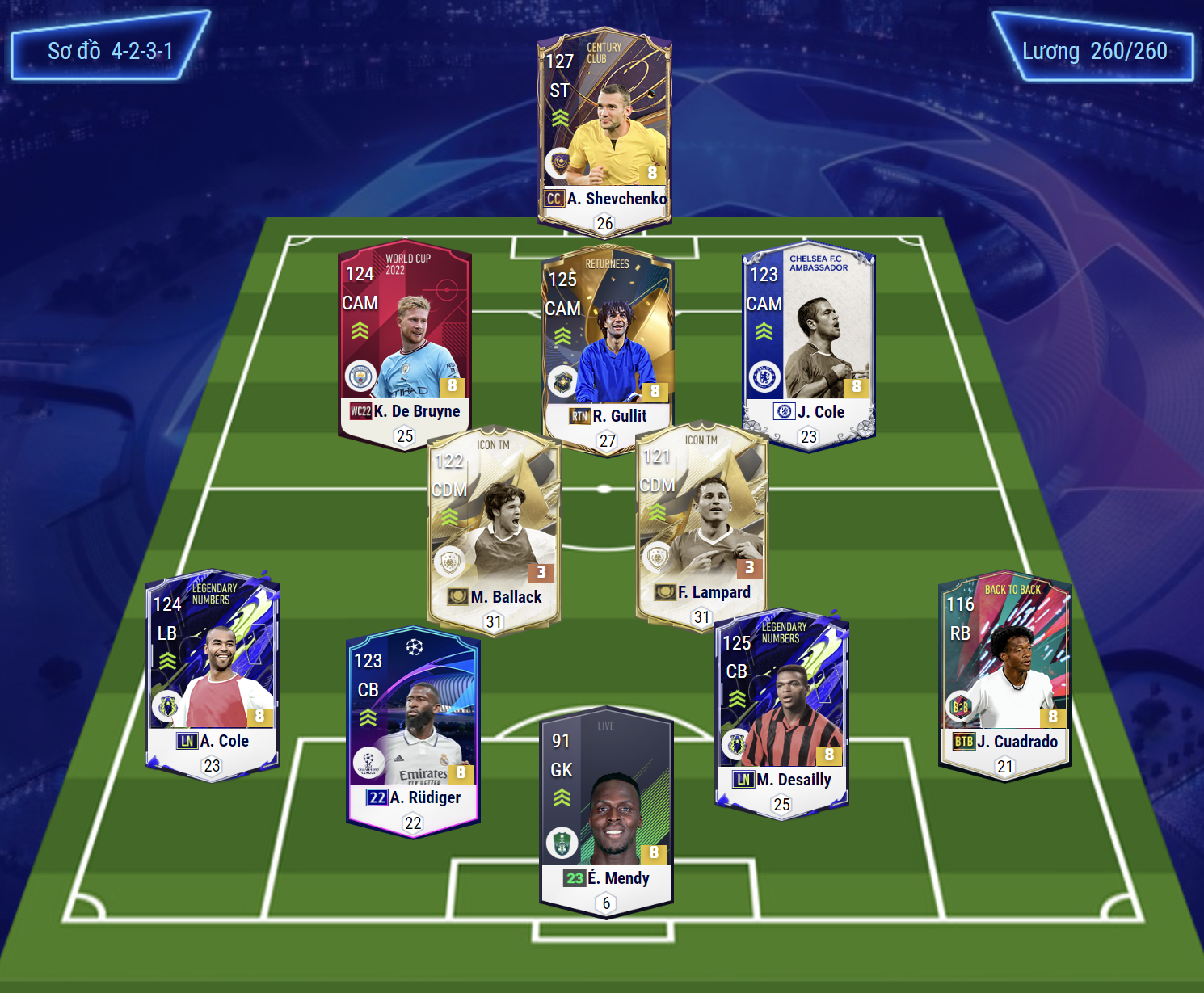 Bộ đôi tiền vệ trung tâm được tin dùng là Ballack ITM và Lampard ITM. Đây được xem là cặp tiền vệ trung tâm quốc dân đáng dùng nhất thời điểm hiện tại cho team Chelsea. Bộ tứ vệ với A. Cole và Cuadrado đang được đánh giá rất cao bởi sự toàn diện cả ở phòng ngự lẫn leo biên tấn công. Bức tường thép với Rudiger và Desailly sở hữu tốc độ lẫn sức mạnh nổi bật bảo vệ khung thành của Mendy.