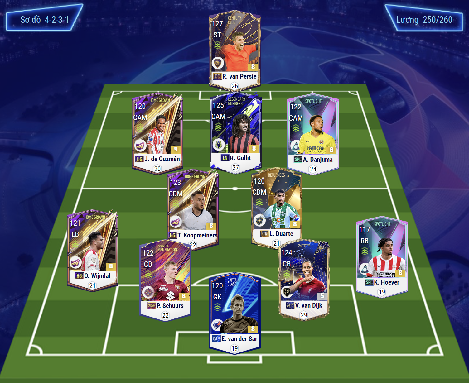 Sơ đồ 4231 được lựa chọn với vị trí tiền đạo cắm là Persie. Bộ 3 tiền vệ công gồm Gullit ở vị trí CAM. Cặp đôi tiền vệ công lệch trái phải lần lượt là Guzman và Danjuma. Đây được xem là những cái tên trẻ có tiềm năng và hiệu quả ở vị trí hiện tại.