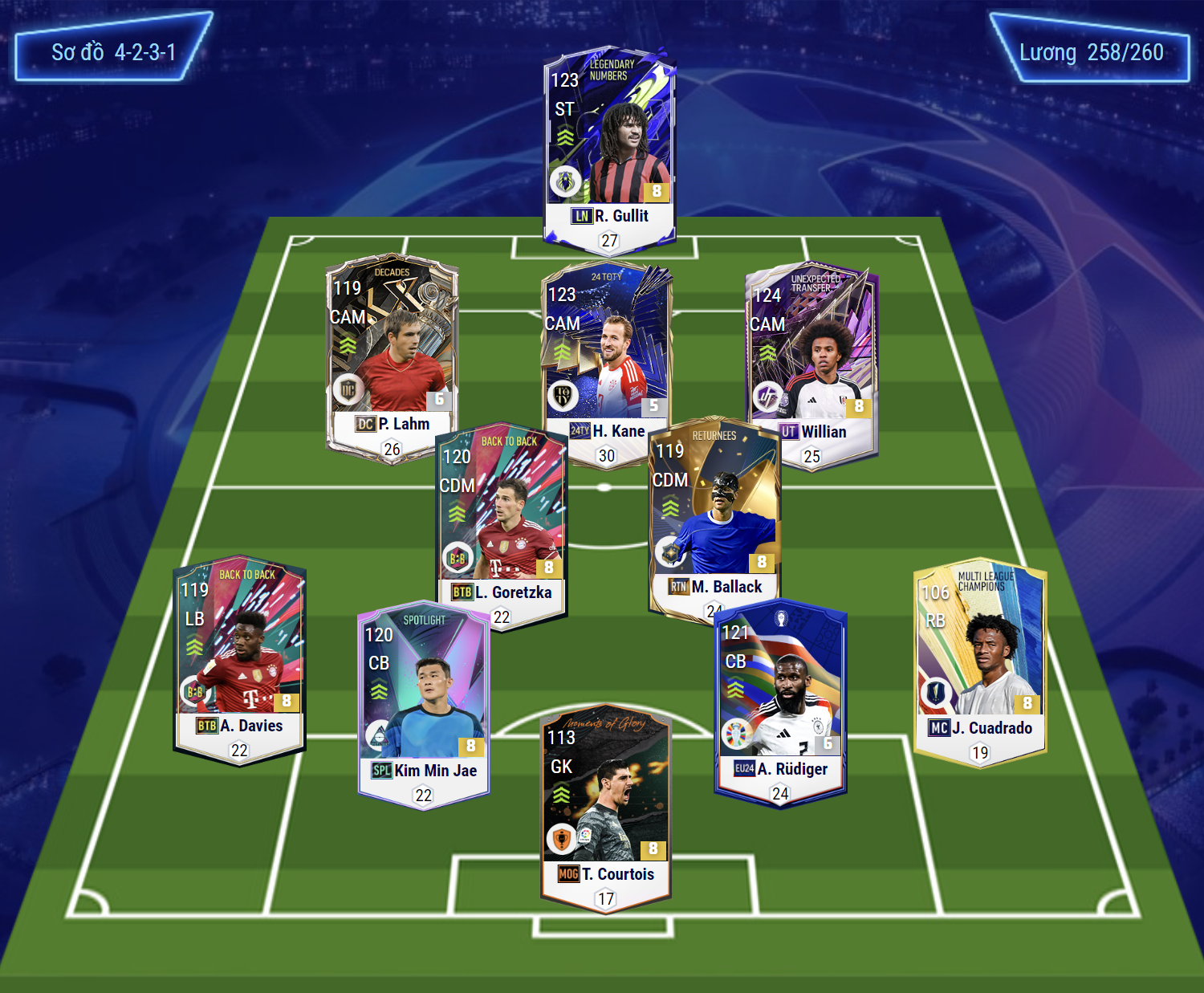Sơ đồ 4231 được thiết lập cân bằng, với vị trí tiền đạo cắm được lựa chọn là Gullit. Hộ công cho anh ở vị trí CAM là Harry Kane một trong những cái tên quốc dân trong khi đó 2 vị trí tiền vệ công lệch LAM, RAM lần lượt là Lahm và Willian.