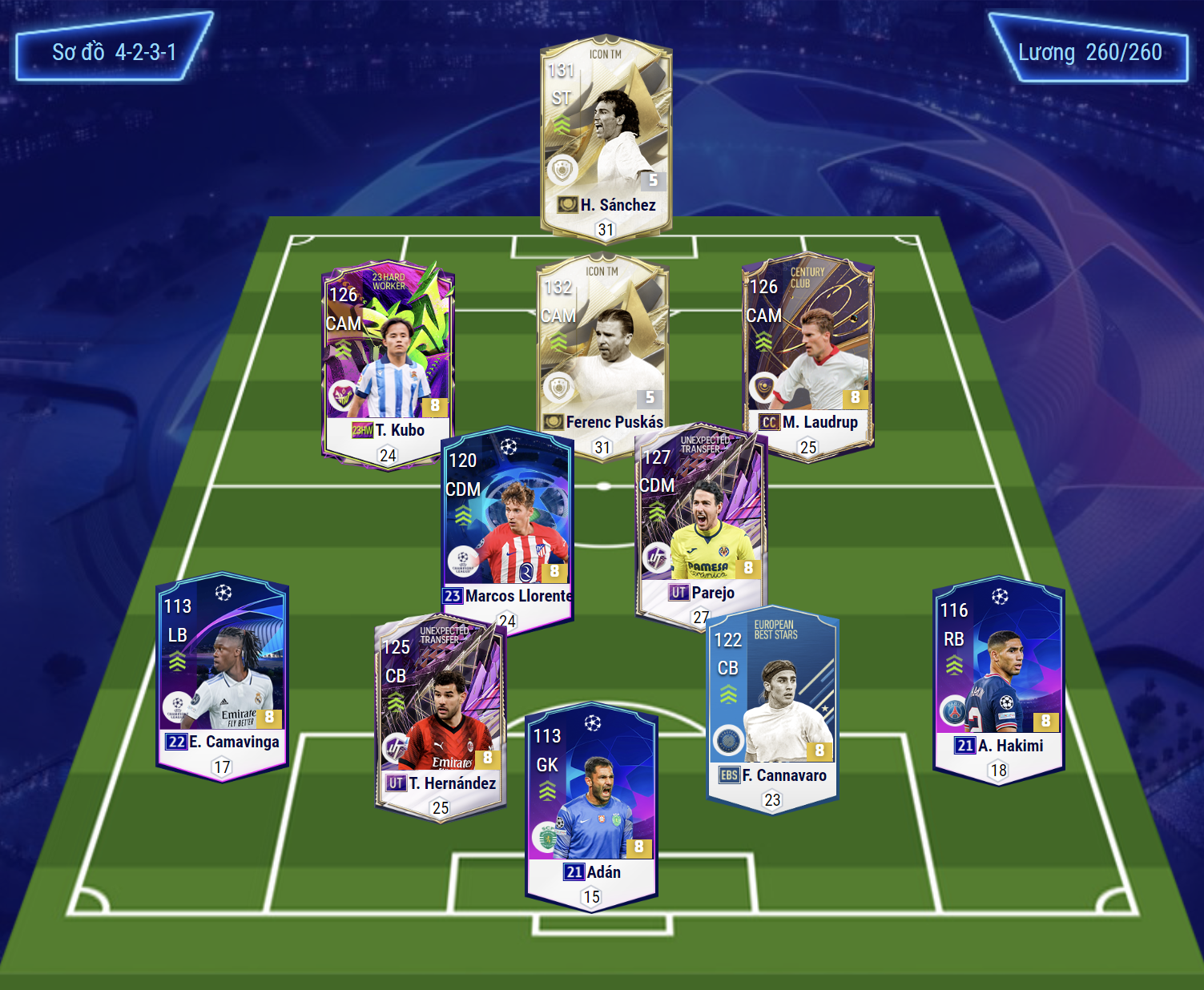 Sơ đồ 4231 với vị trí tiền đạo cắm được lựa chọn là Hugo Sanchez. Bộ 3 tiền vệ trung tâm với Puskas sẽ đảm nhiệm vai trò tiền vệ công CAM. Trong khi đó cặp đôi tiền vệ công lệch trái phải lần lượt là Kubo và Laudrup.