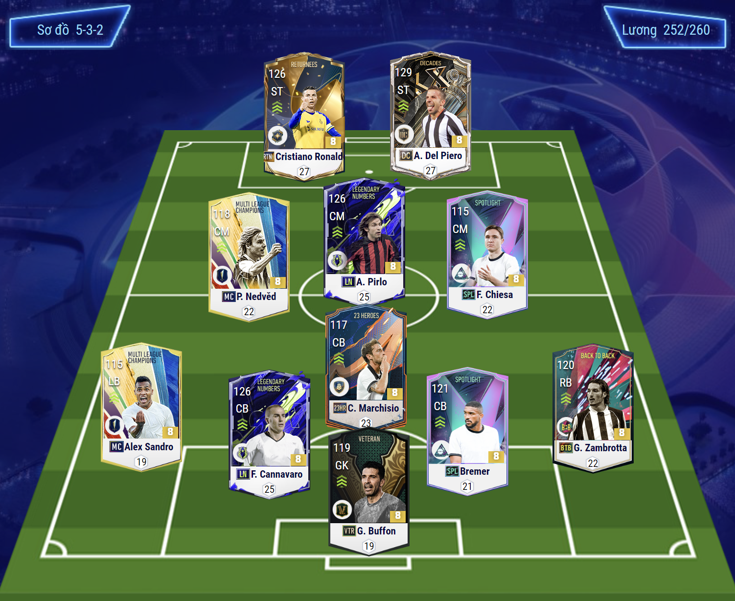 Sơ đồ 532 với cặp đôi tiền đạo được tin dùng là Del Piero và Cristiano Ronaldo. Bộ đôi tiền vệ trung tâm được tin dùng thời điểm hiện tại là Nedved, Pirlo và Chiesa. Cả 3 có thể biến tấu linh hoạt theo nhiều sơ đồ khác nhau.