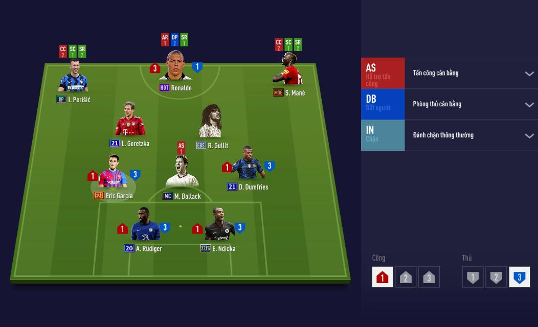 Với thiết lập này ngay cả khi bạn tấn công thì 3 CDM đều không dâng quá vạch giữa sân, để đảm bảo đội hình không bị động khi chẳng may đội bạn bị mất bóng và dính phản công. Vậy trường hợp mất bóng thì phải làm sao ? hãy bình tĩnh và thay đổi chiến thuật của đội hinh để tổ chức phòng ngự tốt nhất với chiến thuật được chuyển về 4-1-4-1 như sau