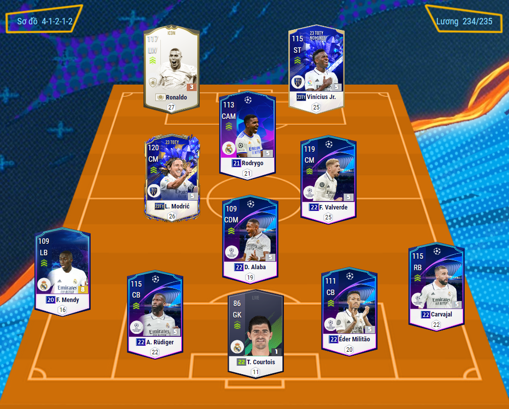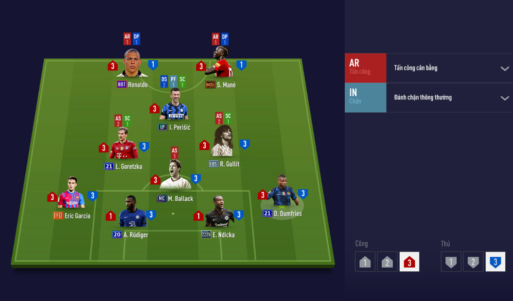 4 cầu thủ tấn công cần có tốc độ càng nhanh càng tốt, để có thể xâm nhập vòng cấm một cách nhanh nhất có thể, như trên chúng ta thấy 3 cái tên là Ronaldo, Vinicius và Rodrygo...đều là những cái tên có thừa tốc độ và độ phản ứng với các tình huống. Đặc biệt khi vừa mất bóng thì cả 3 đều có thể ập vào lấy bóng rất nhanh mà không bị khựng lại. Hiện tại thì Nexon chưa fix lại việc phản ứng của các hậu vệ khi tackle bóng nên các tiền đạo có phản ứng cao luôn có được lợi thế.