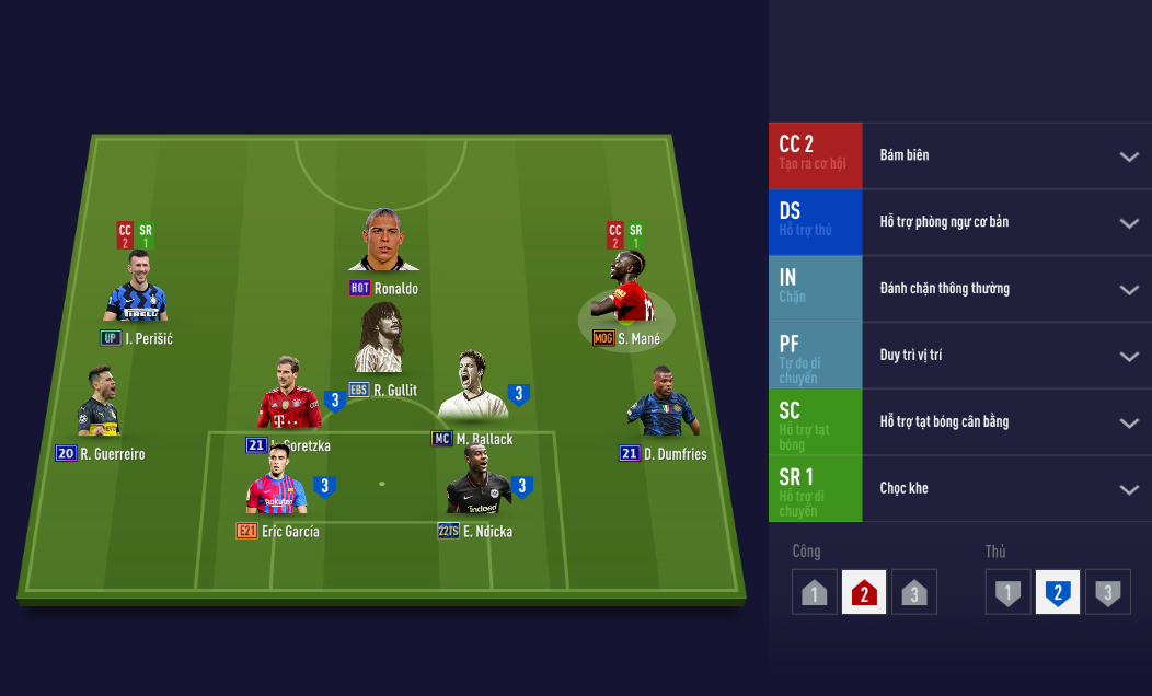 Về cơ bản đây là sơ đồ 42211 nhưng HLV này hơi biến tấu một chút khi anh kéo Gullit lúi xuống đá CM còn Ronaldo thì lùi về CAM. Có thể cách xuất phát như này hơi có phần tiêu cực khi nó giống với một sơ đồ mang tính phòng ngự nhiều hơn là tấn công. Nhưng chúng ta đều biết các HLV của Hàn hay Thái luôn là những người rất ham tìm tòi và sáng tạo trong Fo4. Họ luôn tìm ra những sơ đồ mới để tối ưu hóa phù hợp với gameplay.