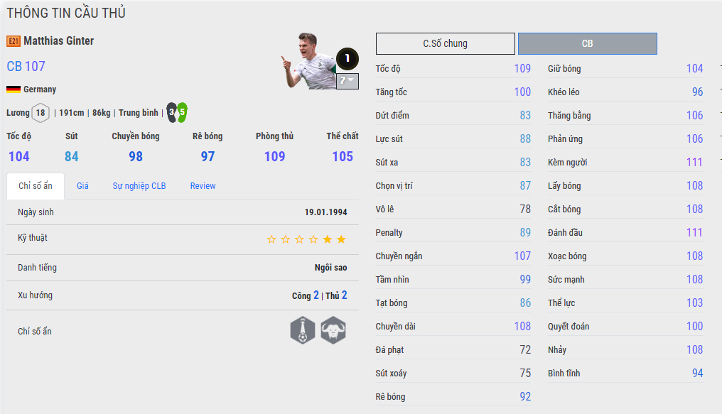 Sẽ hơi bất ngờ khi người được chọn đá cặp với Boateng VTR lại là Ginter chứ không phải Parvard hay Upamecano, Lucas Hernandez...những cái tên được đánh giá rất cao hiện nay. Tuy nhiên cũng phải phải ngẫu nhiên mà Ginter lại được chọn. Ở mức thẻ + 7, tốc độ của Ginter lên tới 109, cho dù tăng tốc hơi chậm nhưng sải chân của một trung vệ cao tới 1m91 là không thể coi thường. Xu thế hiện nay là các trung vệ có chiều cao trên 1m90 luôn có được sử ảo diệu trong game, những tình huống cứu nguy chọc chân rất hay