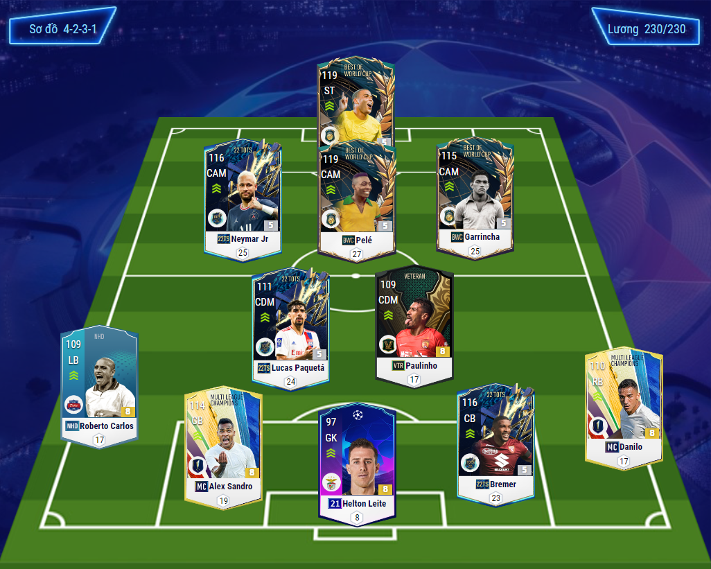 Việc kén người chơi đồng thời hàng hậu vệ của Brazil trong game khá "kém" nên rất ít người lựa chọn lập team color. Tuy nhiên sau khi có được những cái tên chất lượng như Bremer 22TS hay Paqueta 22TS thì chất lượng của đội tuyển nâng lên kha khá. Dưới đây là một team Brazil theo sơ đồ 4231 mà các bạn có thể tham khảo