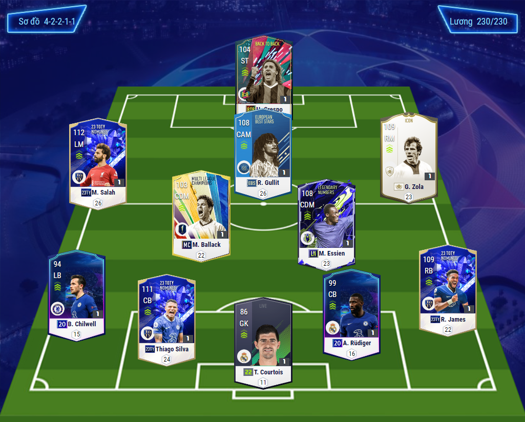 Mức thẻ + của team này tùy vào tình hình tài chính của từng người để có thể sử dụng sao cho vừa túi tiền nhất. Với một vài vị trí như Chilwell hay Rudiger thì vẫn khuyên các bác chọn mức thẻ cao nhất là +8. Có lẽ hai vị trí mà nhiều người chơi lăn tăn nhất ở Việt Nam chính là Salah và Zola đây là hai cầu thủ tương đối khó chơi vì thế nếu như bạn cảm thấy không phù hợp có thể đối qua sử dụng Pedro hoặc Hazard.