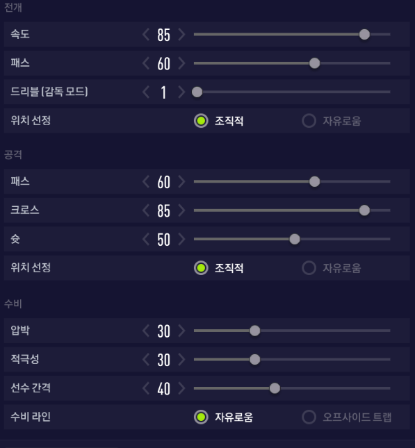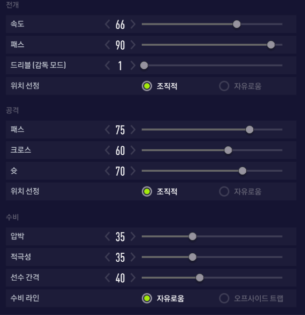 Chỉ số chuyền được đẩy lên 90, với mục đích tạo ra các di chuyển mang tính đột biến với các cầu thủ của đội nhà, tuy nhiên cự ly đội hình được kéo ở mức vừa phải, để đảm bảo các đường chuyền ngắn vẫn là chủ đạo. Như trên hình các bạn có thể thấy rằng nhìn sơ đồ này giống như chúng ta có tới 6 cầu thủ ở tuyến giữa, mật độ khá dày và gần như luôn có phương án chuyền bóng để đảm bảo đối phương không thể cướp được bóng từ bạn