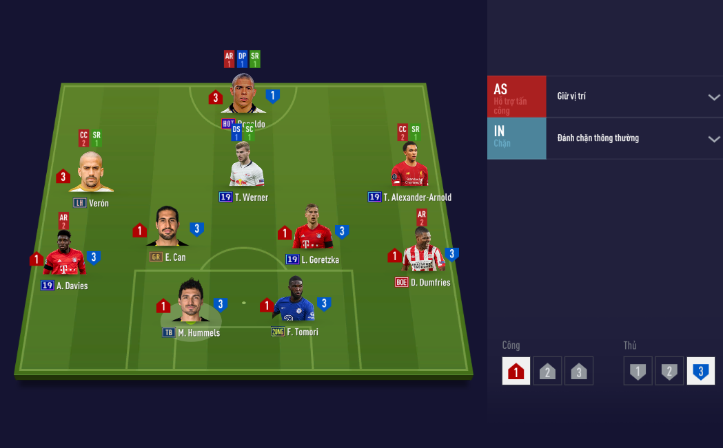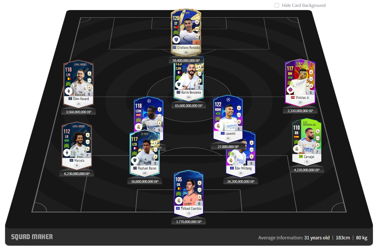 Hàng công vẫn là cặp đôi hoàn hảo Ronaldo - Benzema, hai bên cánh là Hazard LH và Vinicinus 21NG. Tiền đạo trẻ Vinicius 21NG có tốc độ cực tốt và có khả năng xuyên phá cánh cực tốt, phù hợp với đấu pháp của game.