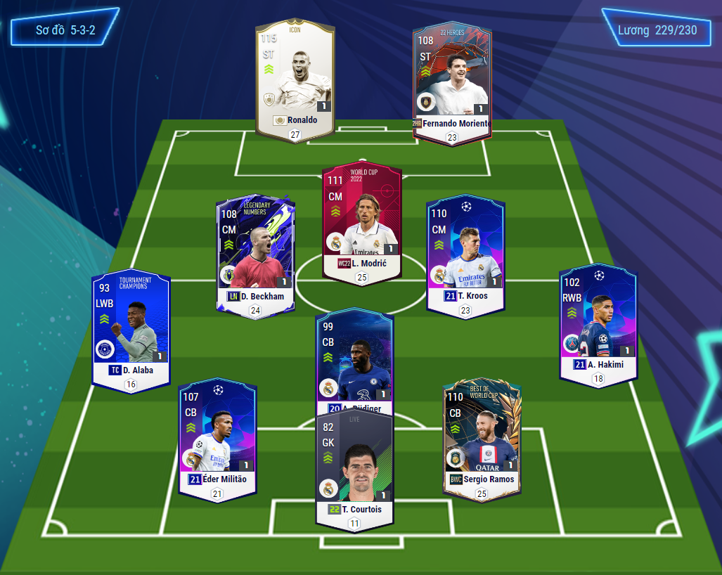 Vị trí của Rudiger 20UCL các bạn chú ý là SW, do trên hình ảnh thể hiện không rõ được vị trí này. Với đội hình này bạn sẽ có được hàng thủ gần như là hay nhất của Real Madrid trong game lúc này. Trong khi đó hàng tiền vệ sẽ là 4 cầu thủ có khả năng làm bóng tuyệt vời nhất. Dù cả 3 không phải là những cái tên được đánh giá cao về hỗ trợ phòng ngự trong game, nhưng cũng là những cầu thủ có thể cắt bóng cũng như thoát pressing cực tốt. Lối chơi áp sát nhanh của nhiều HLV vẫn là một lối đá vô cùng khó chịu mà không có nhiều hàng tiền vệ có thể chống được nếu không có những cầu thủ cầm bóng tốt