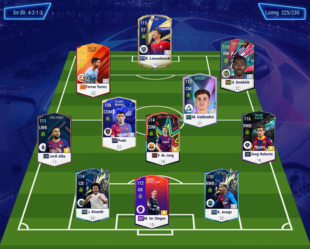 Đây là sơ đồ 4213 của Barca với những cầu thủ đang khoác áo CLB. Khác với ngoài đời thì vào game tuyến giữa của Barca khá là mỏng cơm và thiếu sức chiến đấu theo đúng nghĩa đen. Vì vậy, nếu bạn không phải là người chơi bóng theo hệ kiểm soát thời lượng cầm bóng cao thì hãy cân nhắc có nên đọc tiếp hay không nhé.