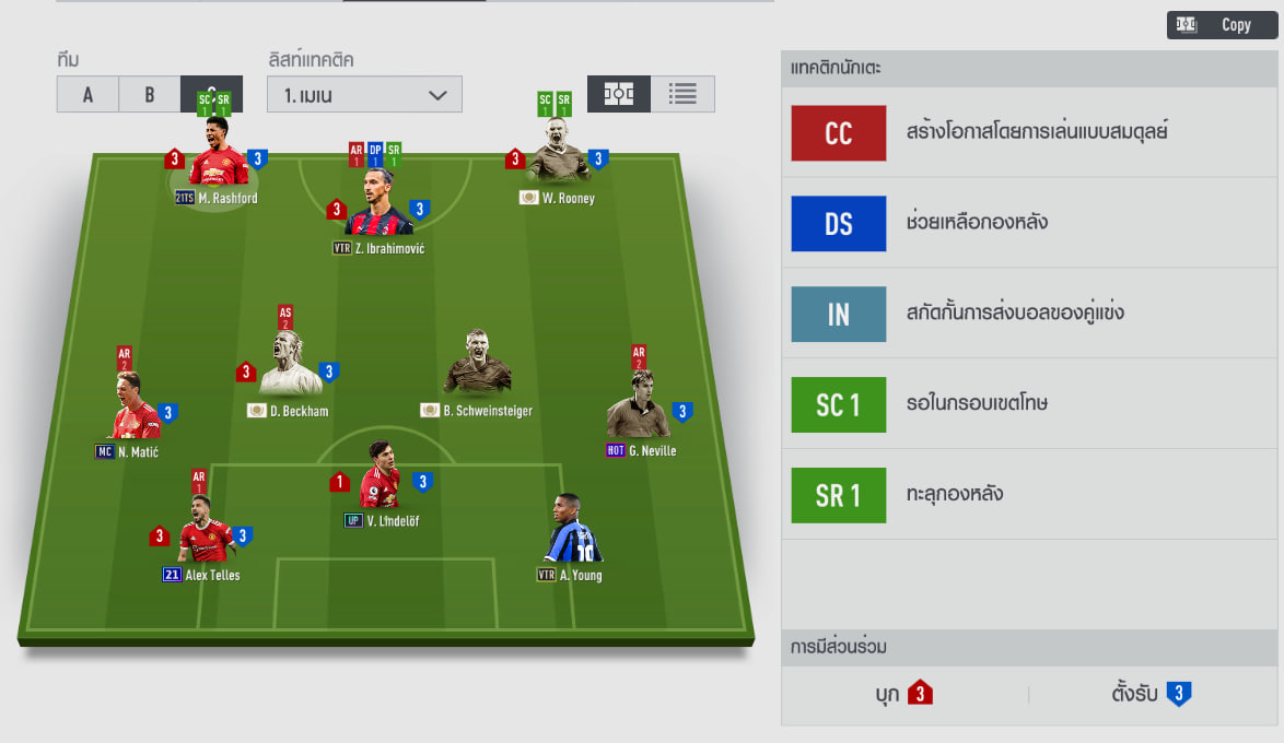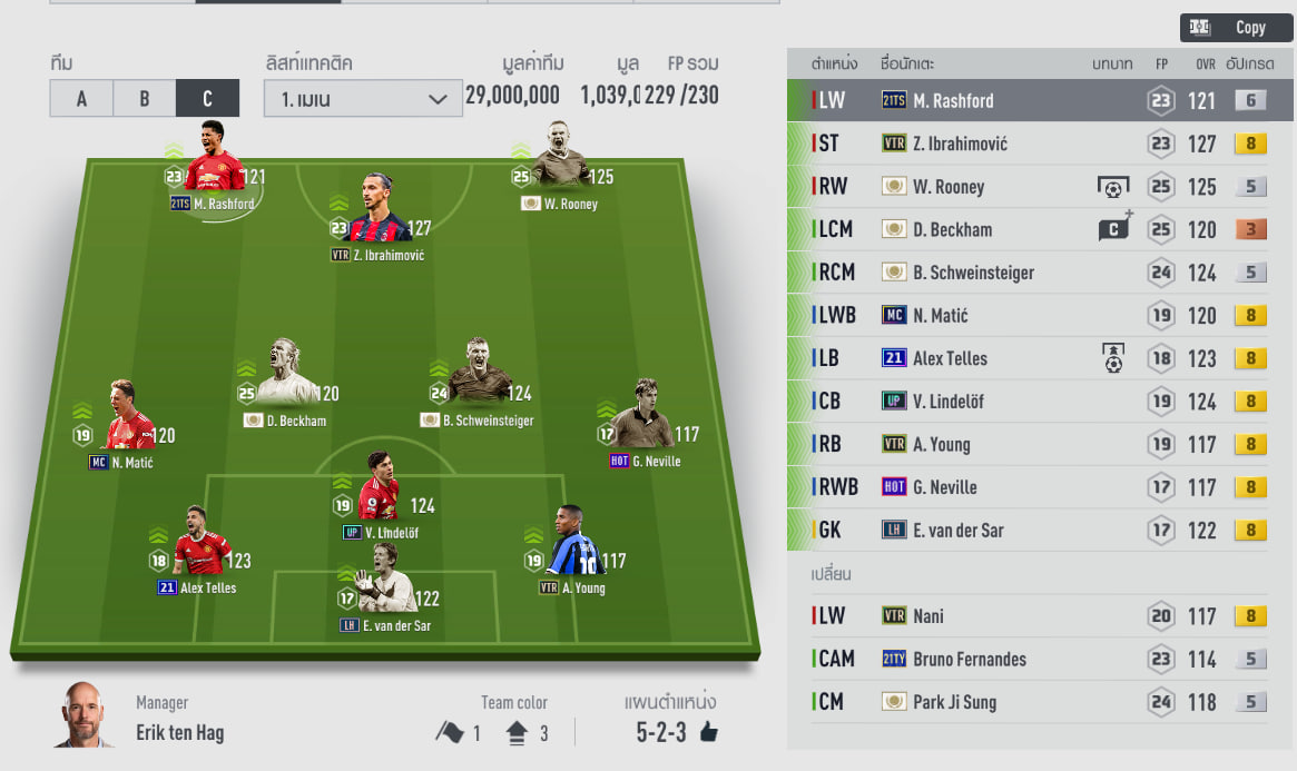 Đây là một đội hình đến từ HLV Thái Lan với sự kết hợp của đương đại và các huyền thoại của câu lạc bộ. Ở thời điểm hiện tại thì những mức thẻ +8 trên có lẽ không còn quá khó với nhiều HLV Việt Nam, tất nhiên giá trị đội hình này cũng không hề rẻ một chút nào. Cá nhân tôi chỉ hơi lấn cấn một chỗ là vị trí của Young - Telles và Matic, không rõ có phải do lỗi hiển thị hay là có ý đồ thực sự của HLV này.