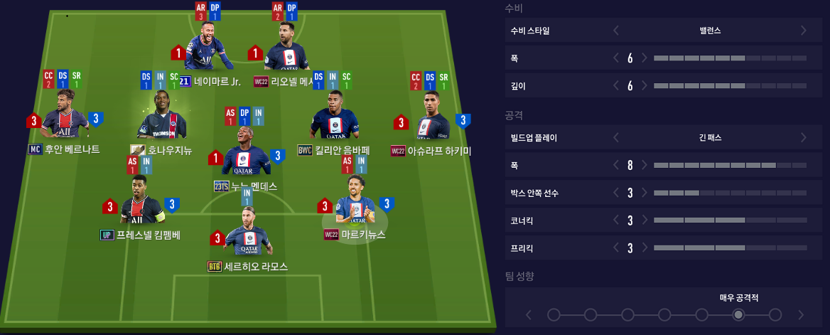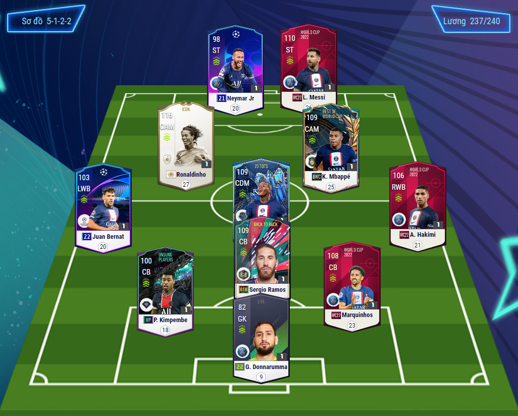 Với sơ đồ này, Ronaldinho và Mbappe được kéo lùi xuống vị trí CAM, nhưng đây mới là hai ngòi nổ chính của sơ đồ này trong các tình huống phản công. Tại sao tôi nói như vậy, hãy quan sát khi đội bạn phòng thủ trước sức ép của đối phương hay các tình huống phạt góc, thông thường người đứng trên cùng đội nhà sẽ là 1 trong 2 tiền đạo.