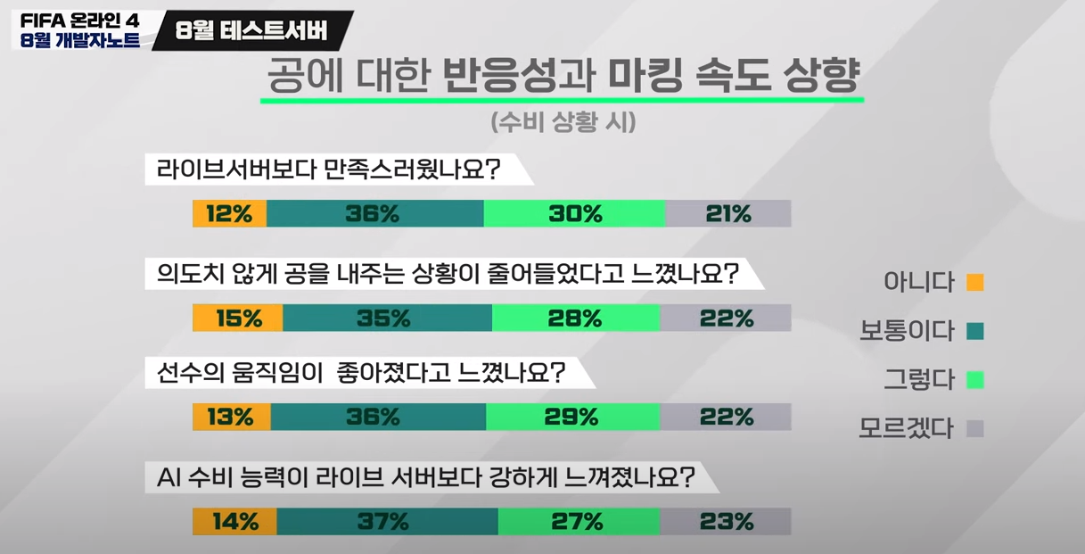 Đây là bản thống kê lấy ý kiến của người chơi về Ai phòng ngự của phiên bản thử nghiệm mà Nexon sẽ tung ra vào 31.8 tới đây. Với màu vàng là số người không đồng ý với Ai phòng ngự, màu xanh đậm là bình thường, còn màu xanh lục là đồng ý, màu xám là : không ý kiến.