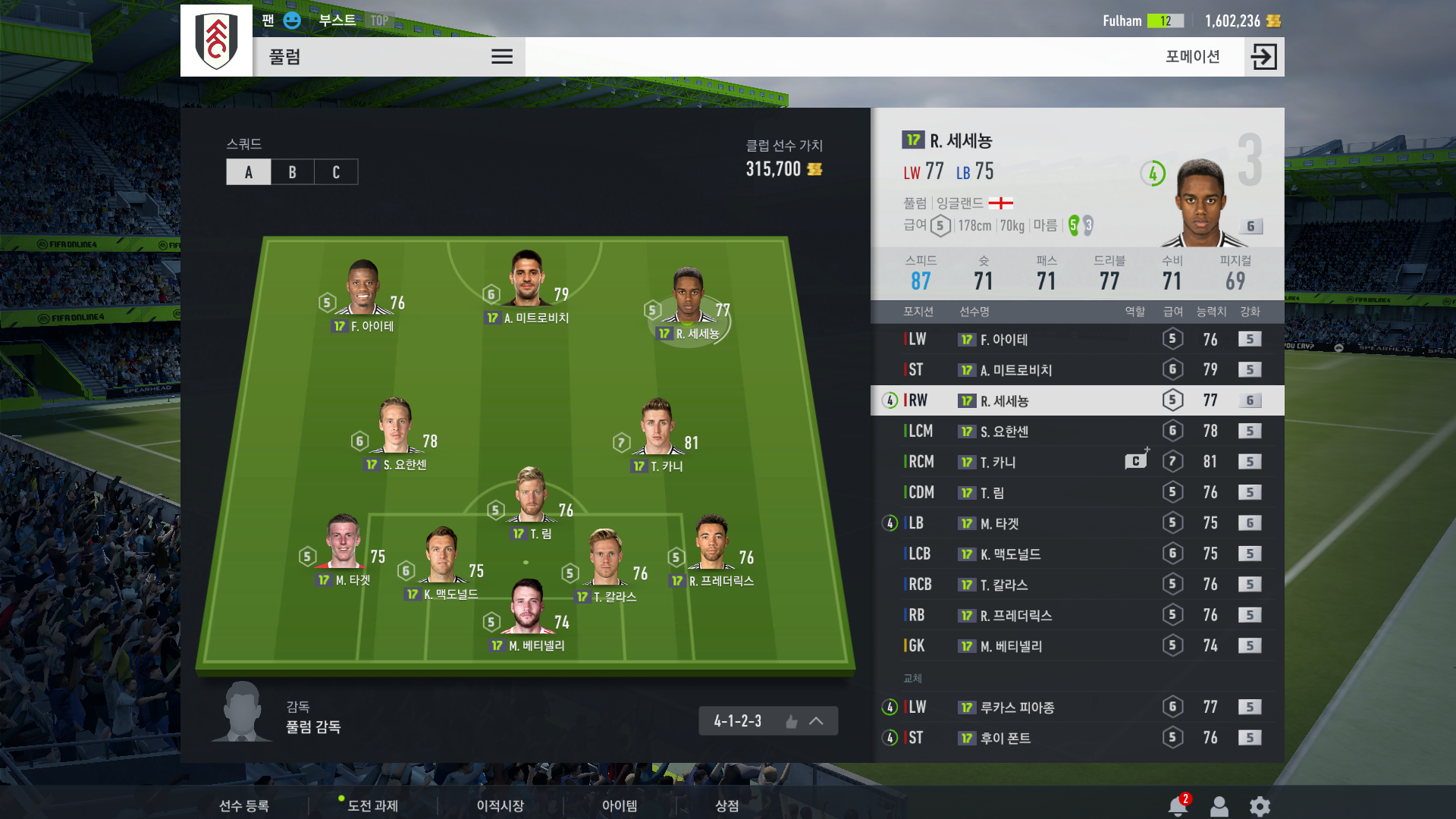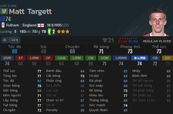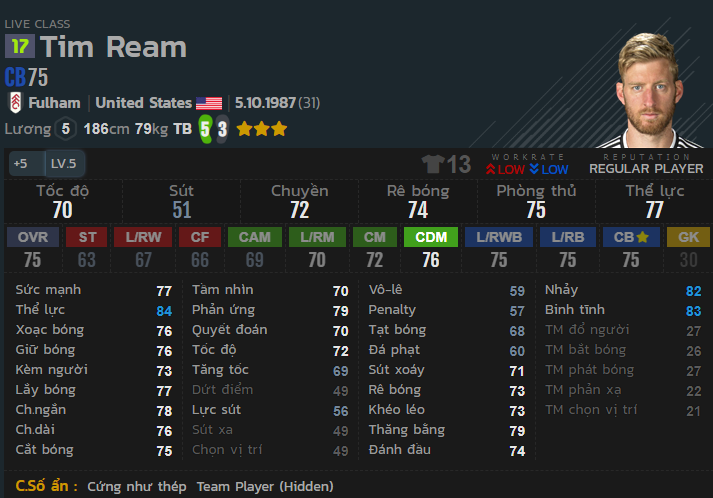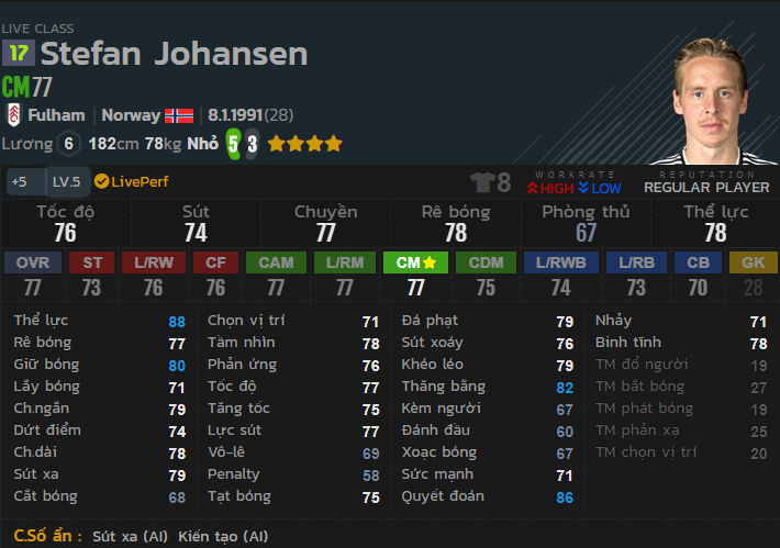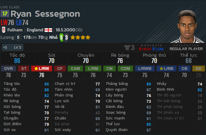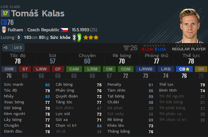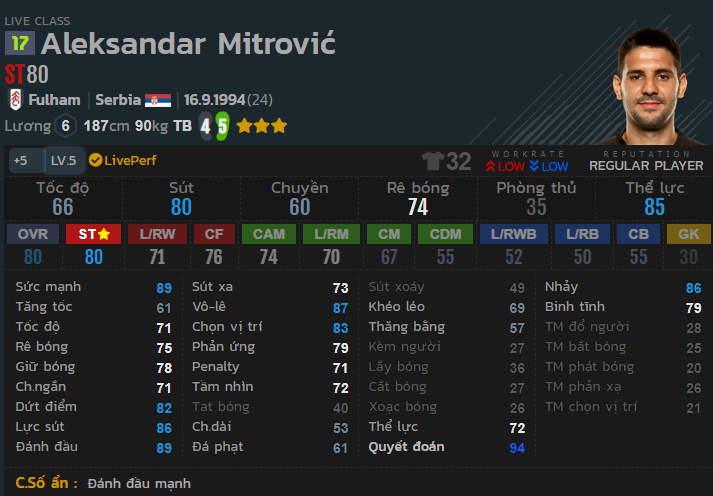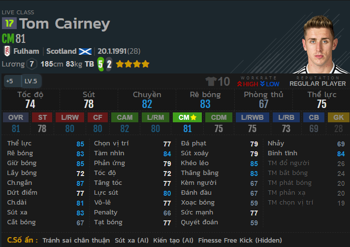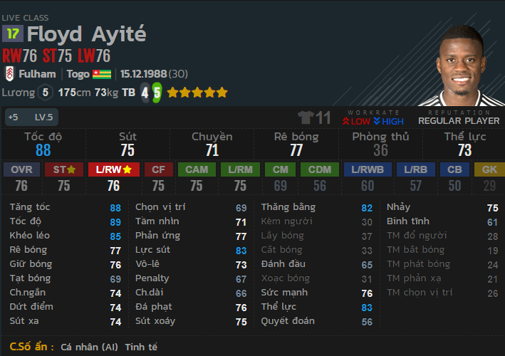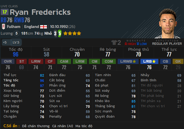 CLB Fulham trong FO4   Danh sách những cái tên nên dùng trong đội hình chính của CLB Fulham  Aleksandar Mitrovic (ST) Tiền đạo người Serbia có thể hình tương đối lí tưởng cùng khả năng không chiến vô cùng tốt rất thích hợp với lối đá tạt cánh đánh đầu. Cùng với đó là lực sút cũng như khả năng dứt điểm là rất tốt, bóng đi hiểm và khó bắt. Tuy nhiên Mitrovic lại hơi chậm chạp với tốc độ thấp. Anh chỉ thích hợp với lối đá bám cắm. Floyd Ayite (RW) Ayite có tốc độ tăng tốc cực tốt, khả năng bứt tốc nhanh cùng với đó là thăng bằng cũng như khéo léo cao khiến cầu thủ này cực kì khó bị đẩy ngã trong những pha tì đè và rê bóng ngoặt bóng trở nên dẻo hơn rất nhiều. Thể lực dồi dào giúp cầu thủ này công thủ vô cùng linh hoạt. Điểm yếu của cầu thủ này là khả năng tạt bóng hơi kém với một cầu thủ đá cánh. Chỉ thích hợp để tạt bóng cọc gần. Tạt bóng cọc xa bóng đi hơi phập phù. Ryan Sessegnon (LW) Tiền đạo cánh trẻ sinh năm 2000 của đội tuyển anh là một cầu thủ khá toàn diện ở vị trí hành lang cánh khi có thể thi đấu cả 3 vị trí tiền đạo cánh, tiền vệ cánh và hậu vệ cánh. Tốc độ cao, khéo léo ở mức ổn cùng với 4 sao kỹ thuật khả năng ngoặt bóng, rê bóng của cầu thủ này là khá tốt. Cùng với đó thăng bằng 89 khiến cầu thủ này vô cùng khó bị đẩy ngã. Thể lực 85 giúp Sessegnon lên công về thủ trong suốt 90p mà không sợ đuối thể lực ở cuối trận Stefan Johansen (LCM) Bộ chỉ số tương đối đồng đều cho vị trí tiền vệ trung tâm, cùng với thể lực 88 và tốc độ ở mức 76 sẽ khiến cầu thủ này bao quát sân tốt. Chuyền bóng rê bóng ở mức tốt 77,78 khiến cho vị trí này vô cùng lợi hại khi tấn công. Tom Cairney (RCM) Cairney, nhân tố chủ chốt của clb Fulham trong quá trình thăng hạng. với thể lực 85, chuyền và rê dắt bóng ở mức 82,83 khiến cho cầu thủ này vô cùng dẻo khi xử lý bóng cũng như chuyền bóng. Chỉ số sút tốt và tốc độ ở mức ổn khiến cầu thủ này mạnh trong những pha tấn công và sút xa tầm trung ngoài vòng cấm. Thể hình trung bình, chiều cao lý tưởng và sức mạnh 77 và thăng bằng 83 giúp hoàn thiện khả năng tranh chấp của cầu thủ này ở khu vực giữa sân. Tim Ream (CDM) Mặc dù vị trí mặc định của Ream là CB, tuy nhiên với tốc độ tốt, khả năng chuyền bóng, rê bóng và phòng ngự đều ở mức tốt, Ream thích hợp cho vị trí CDM hơn vì bao quát sân tốt hơn. Cùng với cứng như thép và Team player sẽ là 2 chỉ số hỗ trợ tuyệt vời cho vị trí CDM Tomas Kalas (RCB) Trung vệ có thể hình to, tốc độ tố lê tới 78, sẵn sàng tì đè đua tốc với các tiền đạo tốc độ cao. Khả năng phòng ngự ở mức ổn định khiến cho cầu thủ này vô cùng khó chịu trên sân. Kevin McDonald (LCB) Vị trí mặc định CDM tuy nhiên với chiều cao cực kì lý tưởng 1m92 cùng với đó là tốc độ hơi thấp và chỉ số ẩn xoạc bóng. McDonald thích hợp hơn cho vị trí CB để chống bóng bổng, cản phá và tì đè khi đối đầu với mẫu tiền đạo cao to của đối phương. Ryan Fredericks (RB) Tốc độ lên tới 96, cực kì nhanh và linh hoạt, khả năng rê bóng tốt và phòng ngự ổn. Fredericks sẽ là cái tên vô cùng khó chịu nơi phòng ngự bên hành lang cánh phải. Matt Targett (LB) Targett có một tốc độ vừa đủ, khả năng phòng ngự tốt và thường xuyên ở nhà, hạn chế lên tham gia tấn công. Đó là điểm mạnh của thẻ cầu thủ này. Marcus Bettinelli (GK) Chiều cao tốt, sải tay dài và khả năng phản xạ ổn