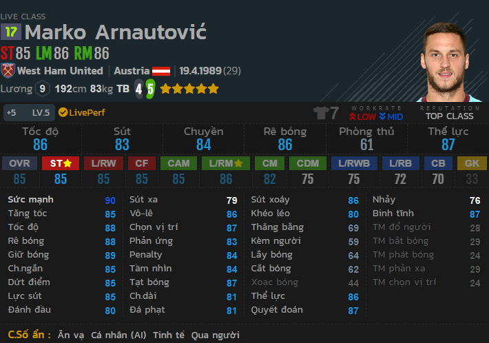 Chiều cao vô cùng lý tưởng lên tới 1m92 tuy nhiên Arnautovic lại vô cùng nhanh nhẹn với tốc độ lên tới 86 và khả năng rê dắt 86 và kỹ thuật 5 sao. Đây cũng chính là cái tên reo rắc nỗi ác mộng lên hàng thủ MU trong trận thắng 3-1 của West Ham với ManU. Ngoài tốc độ, sự khéo léo thì khả năng dứt điểm cũng như tì đè của cầu thủ này là vô cùng tốt. Anh có sự đa dạng trong lối chơi và dễ sử dụng với mọi lối đá khác nhau.