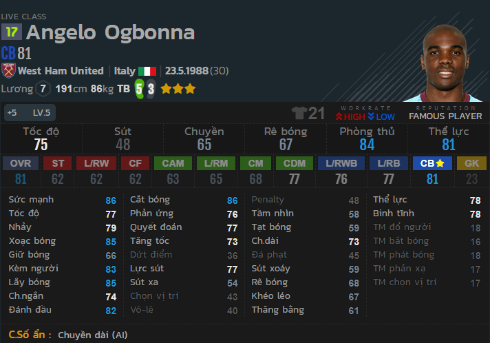 Trung vệ người Ý có chiều cao vô cùng lý tưởng cùng với thể chất tốt và khả năng phòng ngự tốt giúp bảo vệ vững chắc vị trí phòng ngự. Tốc độ lên tới 75 khiến việc đeo bám,bứt lên và cản phá của Ogbonna tạo nên sự khó chịu cho các cầu thủ đội bạn.