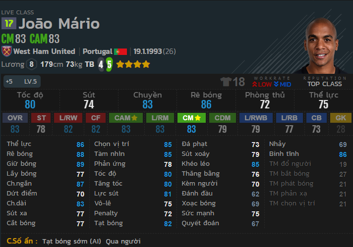 Tốc độ tốt,sút và chuyền bóng tốt, Mario là cái tên vô cùng sáng giá cho vị trí CAM của West Ham. cùng khả năng phòng ngự và thể chất ở mức ổn giúp anh hỗ trợ tốt việc quán xuyến tuyến giữa cùng 2 CDM