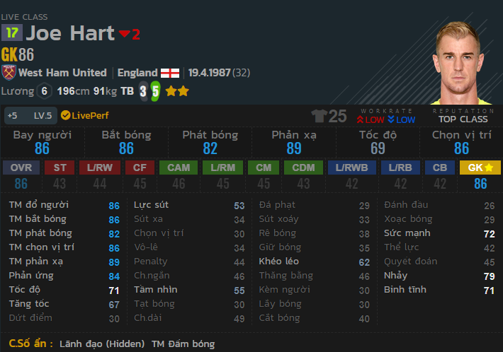 Khả năng đấm bóng tốt, phản xạ ở mức ổn, sải tay dài và khả năng bay người tốt. Joe Hart là cái tên thủ môn sáng giá nhất của West Ham