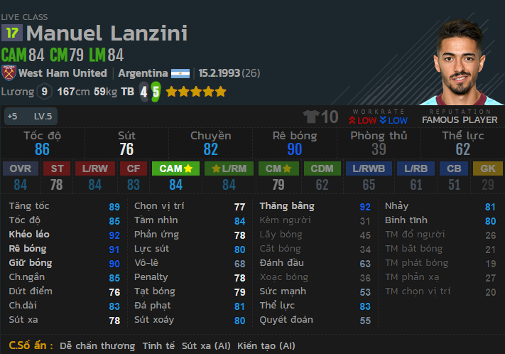 Nhanh nhẹn, khéo léo, khả năng bứt tốc và chuyền bóng tốt giúp Lanzini vô cùng lợi hại khu vực hành lang cánh trái. Thể hình không cao to nhưng thăng bằng lên tới 92 khiến anh vô cùng khó ngã trong các pha tì đè. Khả năng chuyền cũng tạt ở mức ổn giúp anh hỗ trợ tấn công tốt hơn.