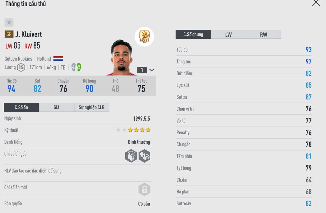 Con trai của một huyền thoại có số có má thời FO3. Kluivert cũng không có được thể hình lý tưởng của ông bố. Nhưng bù lại anh lại có tốc độ và khả năng rê dắt. Không chơi trung phong cắm, Justin chơi dạt cánh và đã đi qua các clb Ajax, Roma và hiện tại là Leipzig. Hiện Justin chính là tương lai của tuyển Hà Lan.