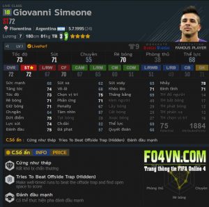 Giovanni Simeone thừa hưởng được thể chất đặc biệt từ người cha của mình. Ít chấn thương, thi đấu khôn ngoan, chạy chỗ tinh tế là điều mà những ai theo dõi hay sử dụng anh trong Fo4 đều dễ dàng cảm thấy. Một con hàng khá ảo trong gameplay hiện tại. Giovanni cao to hơn ông bố và cũng hiền lành đi rất nhiều. Nếu Diego Simeone vào game, tôi tin chắc chỉ số quyết đoán của ông sẽ gấp rưỡi người con của mình là ít.