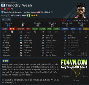Timothy Weah tại PSGCon trai của quả bóng vàng năm 1995, George Weah, đương kim tổng thống Liberia. Giống với ông bố của mình, Timo có cho mình một tốc độ tuyệt vời. 19 tuổi và khoác CLB mạnh nhất nước Pháp. Còn rất nhiều thời gian để cậu bé vươn mình trở lên mạnh mẽ hơn. Biết đâu một ngày nào đó cậu sẽ làm được điều mà người cha vĩ đại đã làm hơn 20 năm trước. Trong Fo4 thì Timo cũng được săn đón rất nhiều, bởi tốc độ mà cậu sở hữu là quá tốt với mức thẻ 73. dễ dàng ép lên cộng cao. Và thi đấu khá tốt so với chỉ số thực tế.