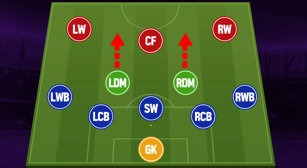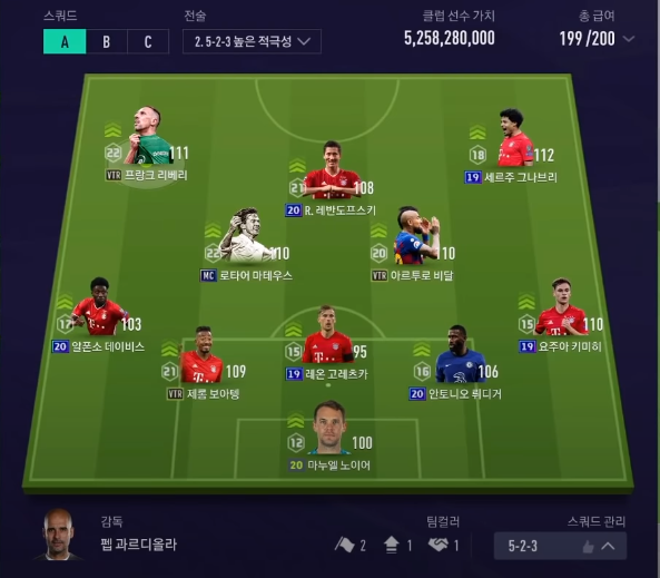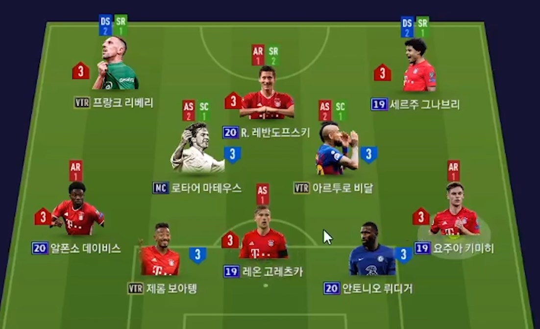 Đây là sơ đồ mà HLV này sử dụng, với Lewandowski được kéo xuống đá CF. Trong khi đó Goretzka đá vị trí SW chứ không phải là CB. Và đây cũng là team color Bayern Munich nhé các bạn. Một team mạnh nhất cho meta hiện tại.