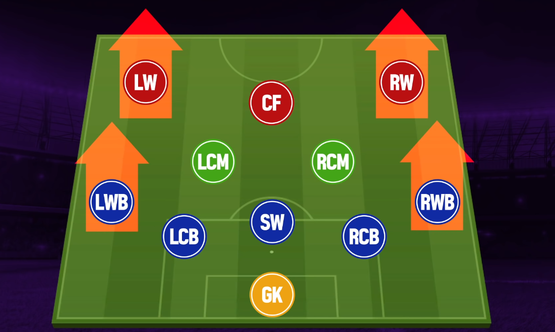 Lối chơi chủ lực của 5-2-3 đó là tấn công cánh, với sự cơ động lên xuống sẽ giúp cho những pha chồng biên được thực hiện liên tục cũng như tạo sự khó chịu cho đối thủ
