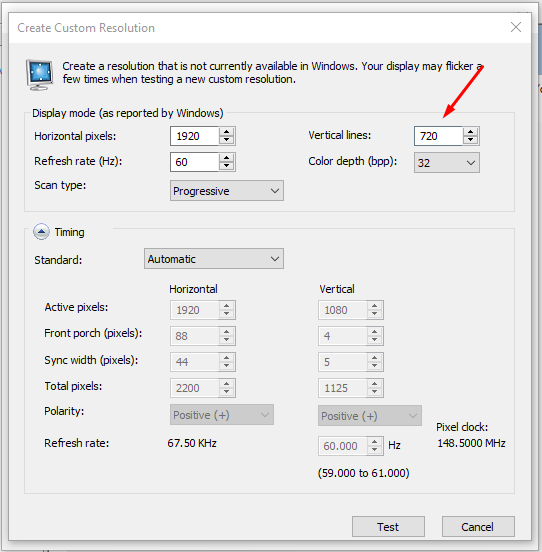 Chỉnh chỗ này về 720, sau đó ấn vào nút test và đồng ý
