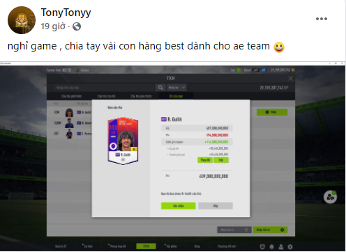 Mới đây thì thông tin đại gia số 1 làng game FO4 hiện nay - Tony. Đã tuyên bố nghỉ game ( FO4 ) sau khi đăng tải một bức hình đã bán Gullit HOT +8