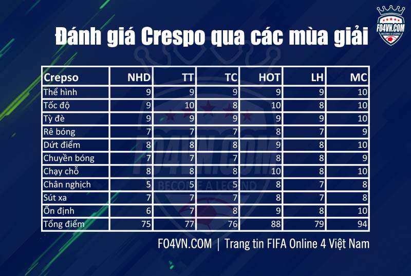 Với mùa giải này Crespo đã được bỏ chỉ số ẩn tiền đạo mục tiêu. Anh được giải phóng khỏi vai trò trung phong cắm. Với Crespo mùa MC, nếu bạn đá anh trong sơ đồ một tiền đạo có thể vẫn dùng tốt , nhưng sẽ là ổn hơn nhiều nếu đá các sơ đồ 2 tiền đạo trở lên. Các bạn có thể xem bài review ở link phía trên. Crespo MC rê bóng mượt hơn, tỳ đè có phần khỏe hơn chút với mùa HOT, còn các điểm khác không có quá nhiều sự khác biệt.