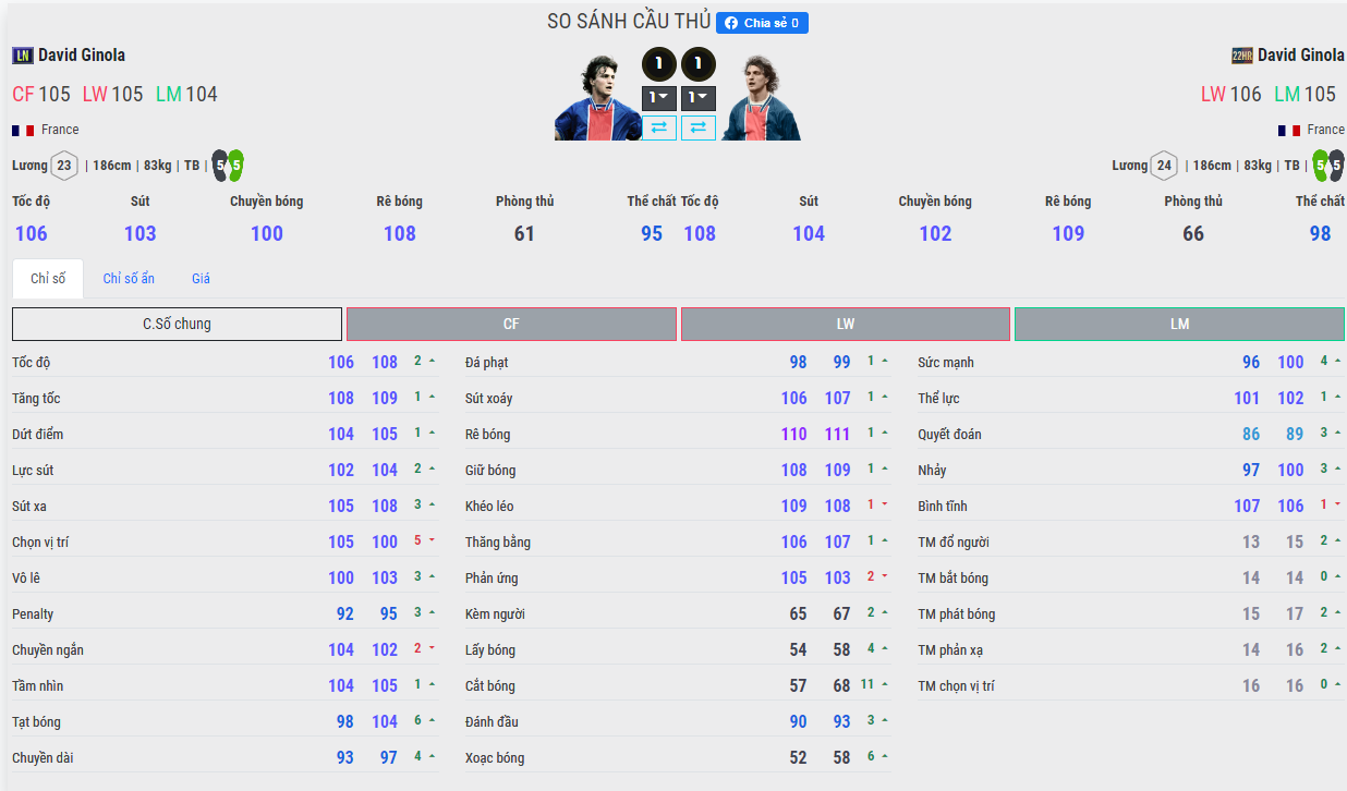 2. Kiến tạo : Nếu bạn nhìn trên thẻ sẽ thấy mùa LN có thêm một vị trí là CF trên thẻ, tuy nhiên thực tế thi đấu lại cho thấy Ginola 22HR là cầu cthur có khả năng kiến tạo tốt hơn, những đường chuyền vào cho Ginola 22HR có độ chính xác và xoáy hơn. Một phần rất ít người chơi đá Ginola ở vị trí CF nên mùa LN có thể chưa phát huy hết sức mạnh của mình.