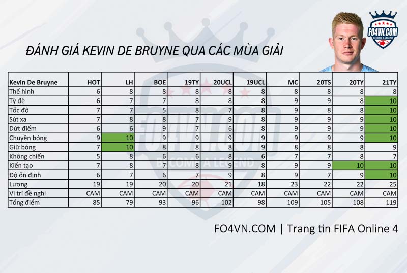 Bruyne là tiền vệ đương đại hiếm hoi được các HLV sử dụng trong các trận đấu ranking bên cạnh các huyền thoại quốc dân. Không phải ngẫu nhiên mà cầu thủ người Bỉ có được sự ưu ái này. Bởi anh có những đặc điểm của một tiền vệ hàng đầu. Cái khó của người chơi là làm sao chọn được mùa giải vừa với mục đích sử dụng, Khi mà Bruyne có cả tá mùa giải với chỉ số cứ na ná nhau.