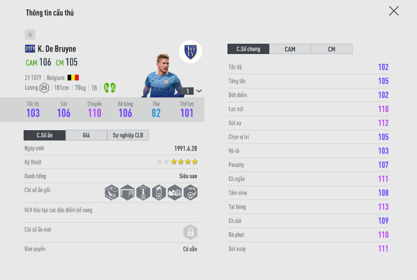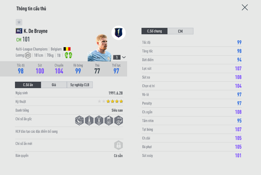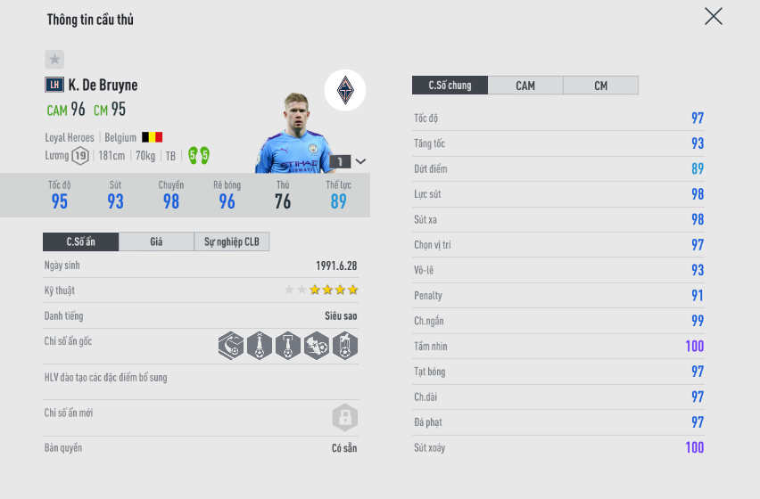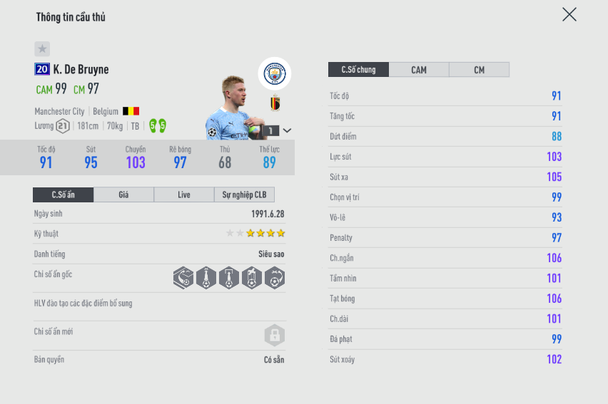 Với mức lương chỉ có 22. Bruyne có thêm chỉ số ẩn nỗ lực đến cùng. Tất nhiên cái gì cũng có lý do của nó cả, đó là sự thiếu ổn định, có khi bạn sẽ thấy anh chàng mất hút cả trận, và giờ thi khi đã vào giới hạn, giá của anh là quá cao để đầu tư cho một vị trí có quá nhiều lựa chọn này.