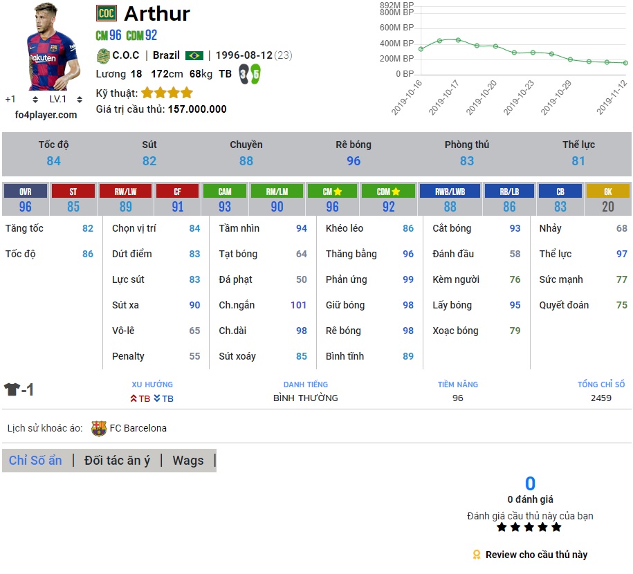 - Tốc độ : Arthur là dạng cầu thủ di chuyển chậm, tốc độ trên 8x nhưng trong game Arthur khá lò dò và khả năng bứt tốc cũng không có nhiều sự nổi bật.