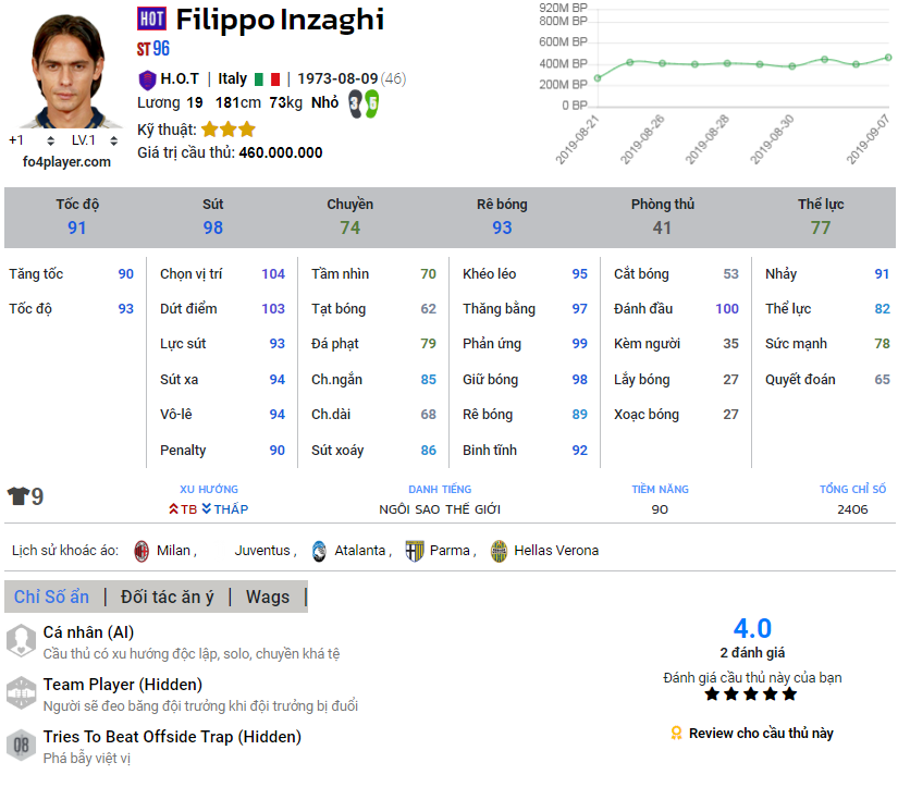 Chỉ số của Inzaghi | Nguồn : F.Inzaghi - Đánh giá trong game