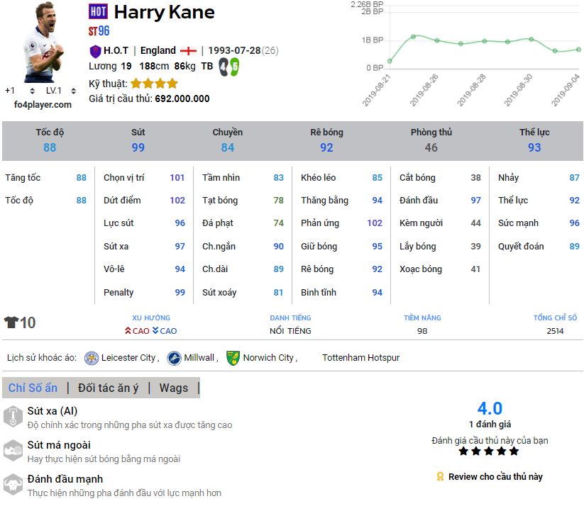 Chỉ số của Kane | Nguồn : H.Kane - Đánh giá trong game