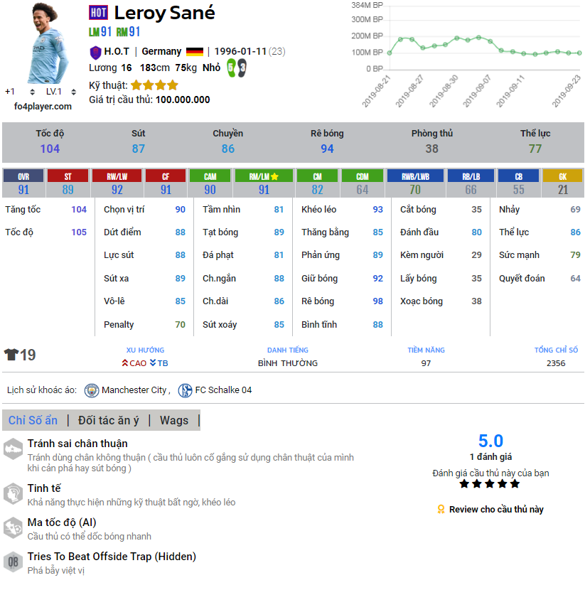 - Tốc độ : Sane bứt tốc rất nhanh. Tốc độ của Sane vượt trội lên hoàn toàn so với những cầu thủ chạy cánh khác. Cảm giác bứt tốc với Sane là rất phê bởi anh vươn lên trước so với những cầu thủ khác rất dễ dàng. Thêm ma tốc độ càng khiến cho anh thành một quân bài chạy cánh lợi hại.
