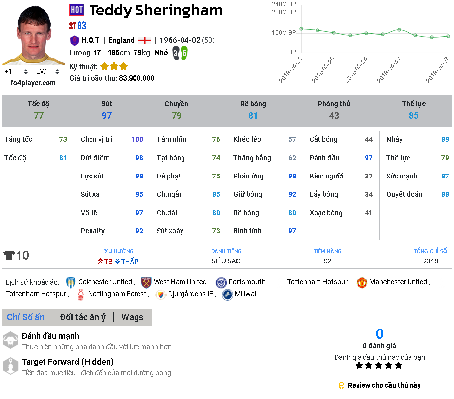 Với màn thể hiện như vậy thì Sheringham vẫn thể hiện được mình là một ST ở dạng mức Khá. Nhưng với vấn đề lương trừ khi bạn là fan của anh ấy thì bạn có dám bỏ 17 lương trong đội hình ra để mua một cầu thủ như thế này về đội không. Câu trả lời nằm ở các bạn. Chấm điểm : 8,4/10 Xem thêm