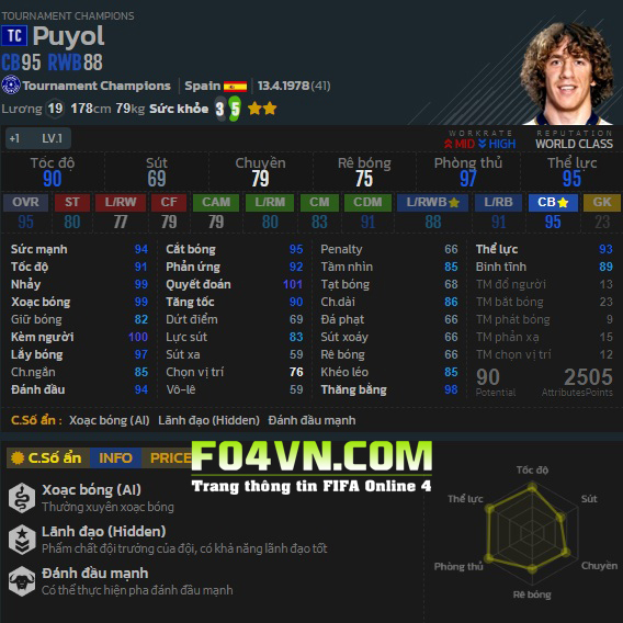 - Thể hình : Thể hình của Puyol không quá to cao nên đôi lúc vẫn có cảm giác anh thực hiện những pha không chiến có phần thiếu ổn định.