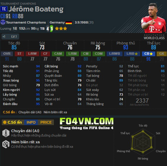 - Lương : Lương của Boateng là 18, khá cao cho một vị trí hậu vệ trung tâm.