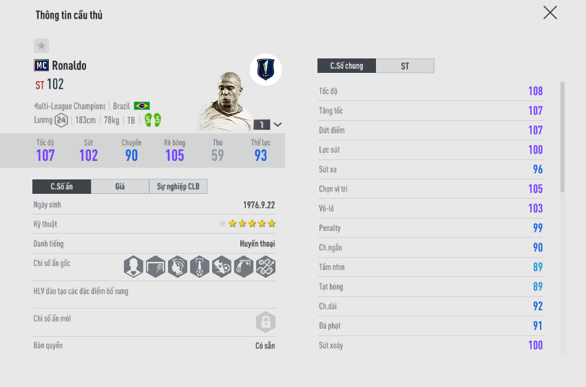 Siêu tiền đạo Ronaldo là cái tên mà bất cứ HLV nào cũng muốn sở hữu, bởi sự toàn diện trong lối chơi, và cực kỳ dễ làm chủ. Từ chuyên nghiệp cho đến thách đấu, đâu đâu bạn cũng có thể thấy sự xuất hiện của tiền đạo người Brazin. Tuy nhiên tùy vào tài chính mỗi người có lựa chọn khác nhau. Vậy sự khác nhau giữa các mùa giải của Ronaldo De Lima ở đâu. Chúng ta sẽ cùng đánh giá.