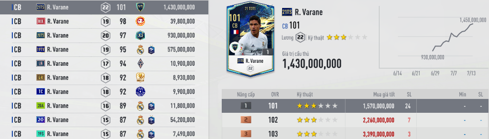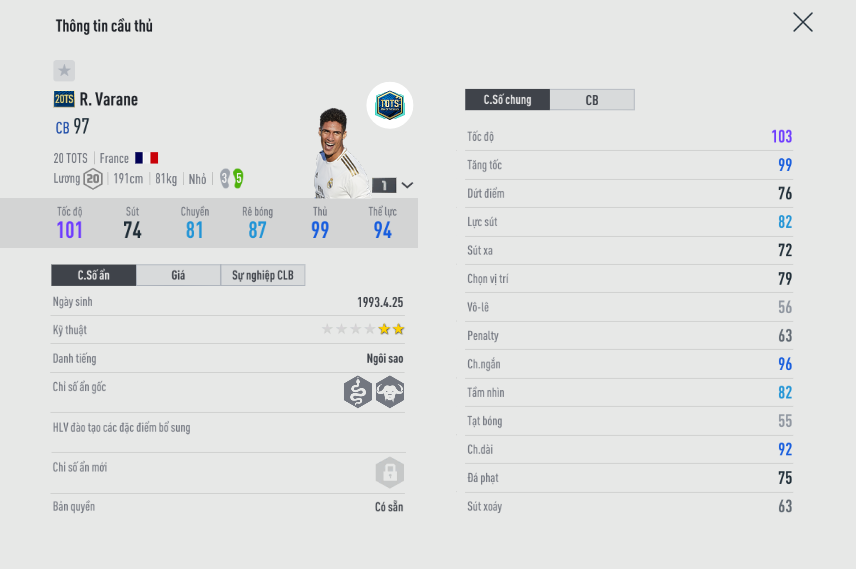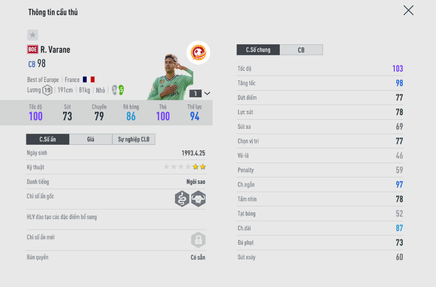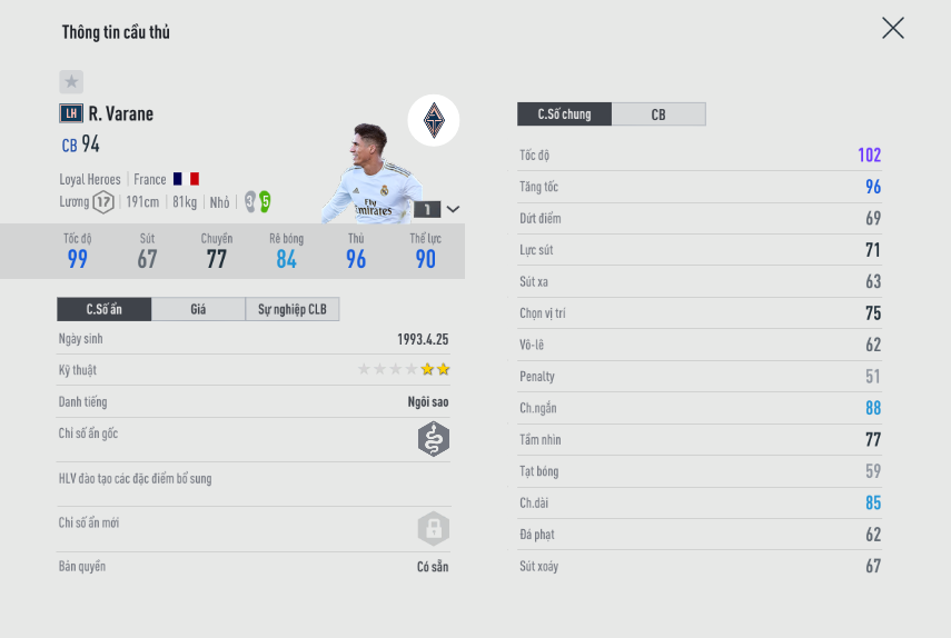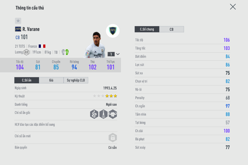 Điểm khác biệt đầu tiên là Varane 21TS có thể hình trung bình, điều cực kỳ quan trọng trong các pha tranh chấp. Đổi lại thì mức lương khá chát, tuy vậy nó lại cực kỳ tốt cho gameplay hiện tại. khi mà sức vóc được nâng cấp thì đồng nghĩa khả năng phòng ngự cũng được lợi thế.