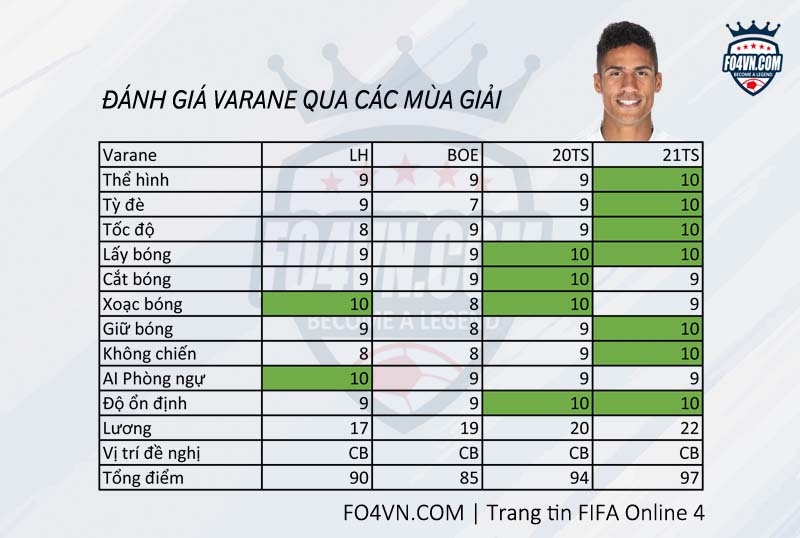 Hậu vệ quốc dân trong FO4 - Varane là cái tên hội tụ đầy đủ mọi phẩm chất cho gameplay 6.0 Tuy nhiên việc lựa chọn anh chàng người Pháp này khá khó khi mỗi mùa giải lại có cái lợi thế riêng. FO4vn xin gửi tới các bạn đánh giá từng mùa giải chi tiết cũng như so sánh với nhau để các bạn có được lựa chọn đúng đắn nhất.