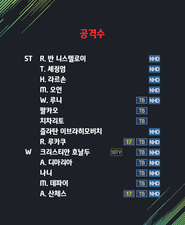Tiền đạo ST R.Van Nistelrooy T.Sheringham H.Larsson M.Owen W.Rooney Falcao Z.Ibrahimovic R.Lukaku RW,LW Cristiano Ronaldo A.Di Maria Nani M.Depay A.Sanchez